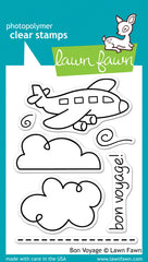 This card features Lawn Fawn's "Blue Skies" stamp and die, "Home Sweet Home" stamp and die, "Good Fortune," "Bon Voyage," and some patterned paper from Into the Woods petite paper pack. Lawn Fawn is also coming out with a die set to complement the "Bon Voyage" stamp set, so this card would be so easy to make with all of the dies!